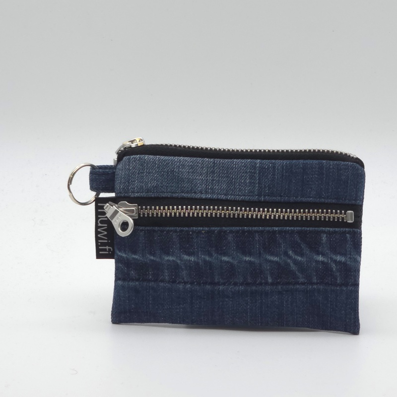 Koko n.13 x 10 cm. Kierrätysfarkusta valmistettu kukkaro, sivussa tasku esim.kolikoille. Kierrätyspuuvilla vuori.